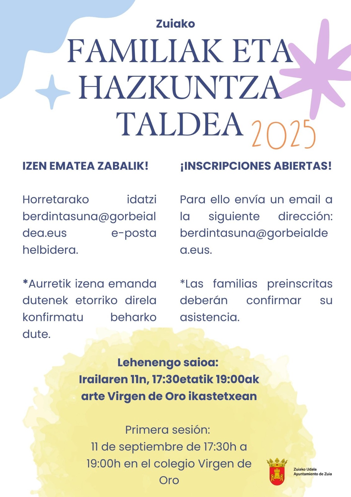 Las familias preinscritas deben confirmar su asistencia enviando un mensaje a berdintasuna@gorbeialdea.eus.