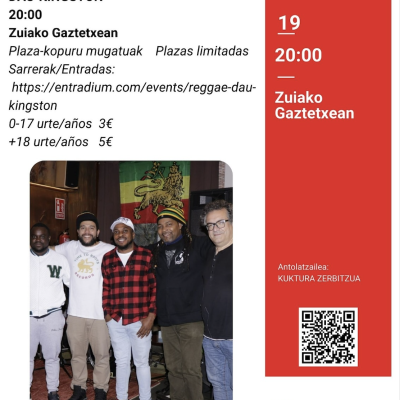 El Ayuntamiento organizará un concierto de reggae en el Gaztetxe: la conocida banda Dau´Kingston formada por músicos africanos y vascos.