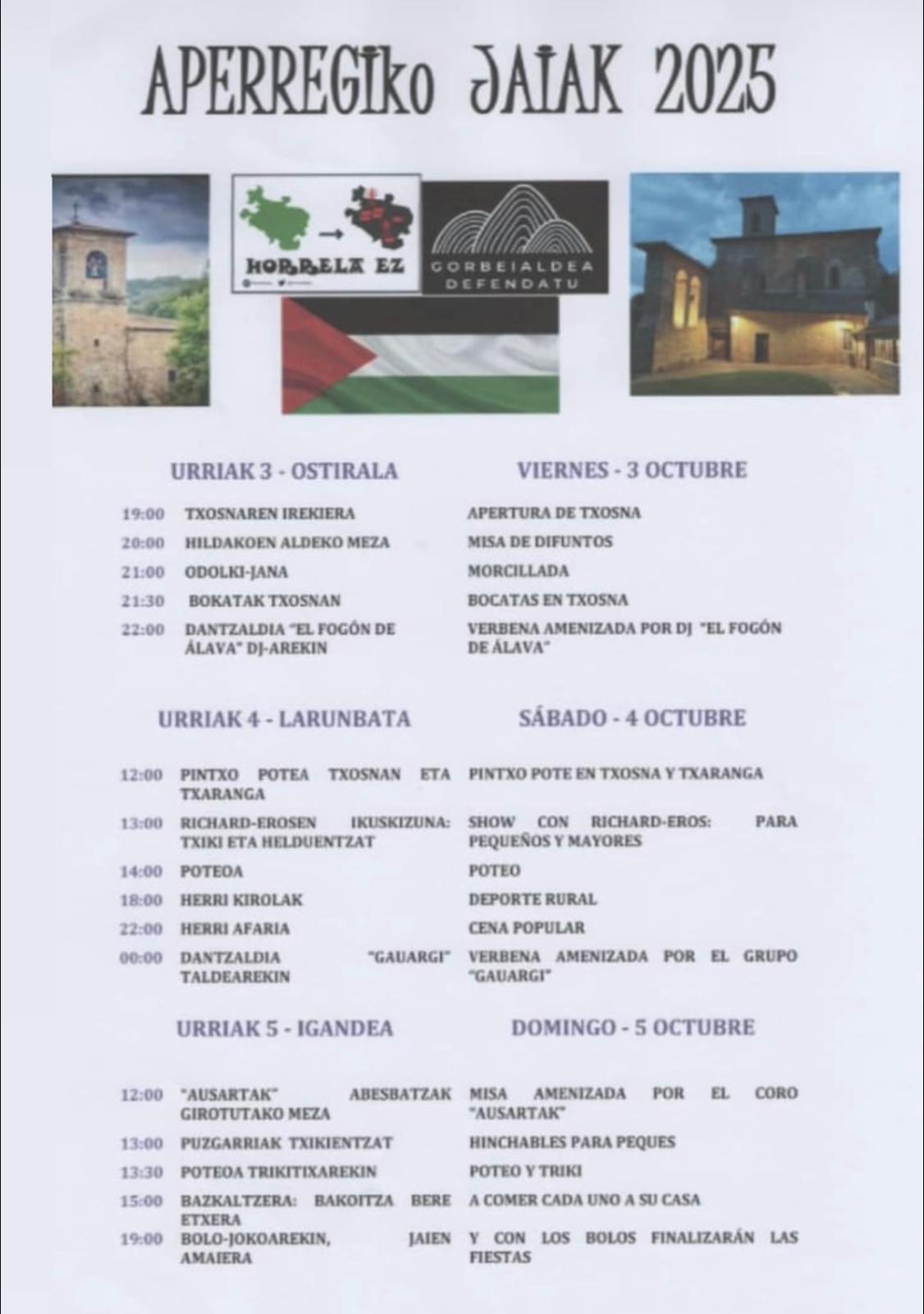 El programa arranca el viernes con la apertura de la txosna, misa por los difuntos, morcillada, bocatas y verbena a cargo del DJ El Fogón de Álava. El sábado continuará con un pintxo pote con txaranga, espectáculo infantil y para adultos con Richard-Eros, poteo, deportes rurales, cena popular y verbena con el grupo Gauargi.