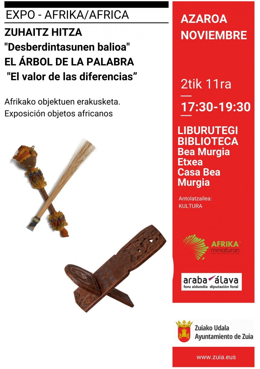 Con ayuda de la asociación Afrika Miniaturan, el Ayuntamiento ha organizado la exposición sobre objetos africanos llamada 'El árbol de la palabra, el valor de las diferencias'.