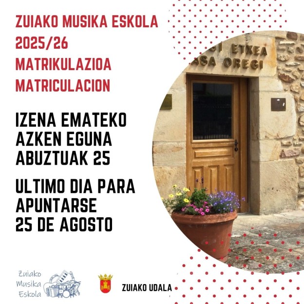 El plazo para matricularse en Zuiako Musika Eskola en el curso 2025-2026 permanecerá abierto hasta el día 25 de agosto. Todas las personas que ya se encuentren matriculadas en el presente curso en alguna de las disciplinas musicales, así como las que hayan causado baja, deberán tramitas la matricula correspondiente para el curso siguiente.