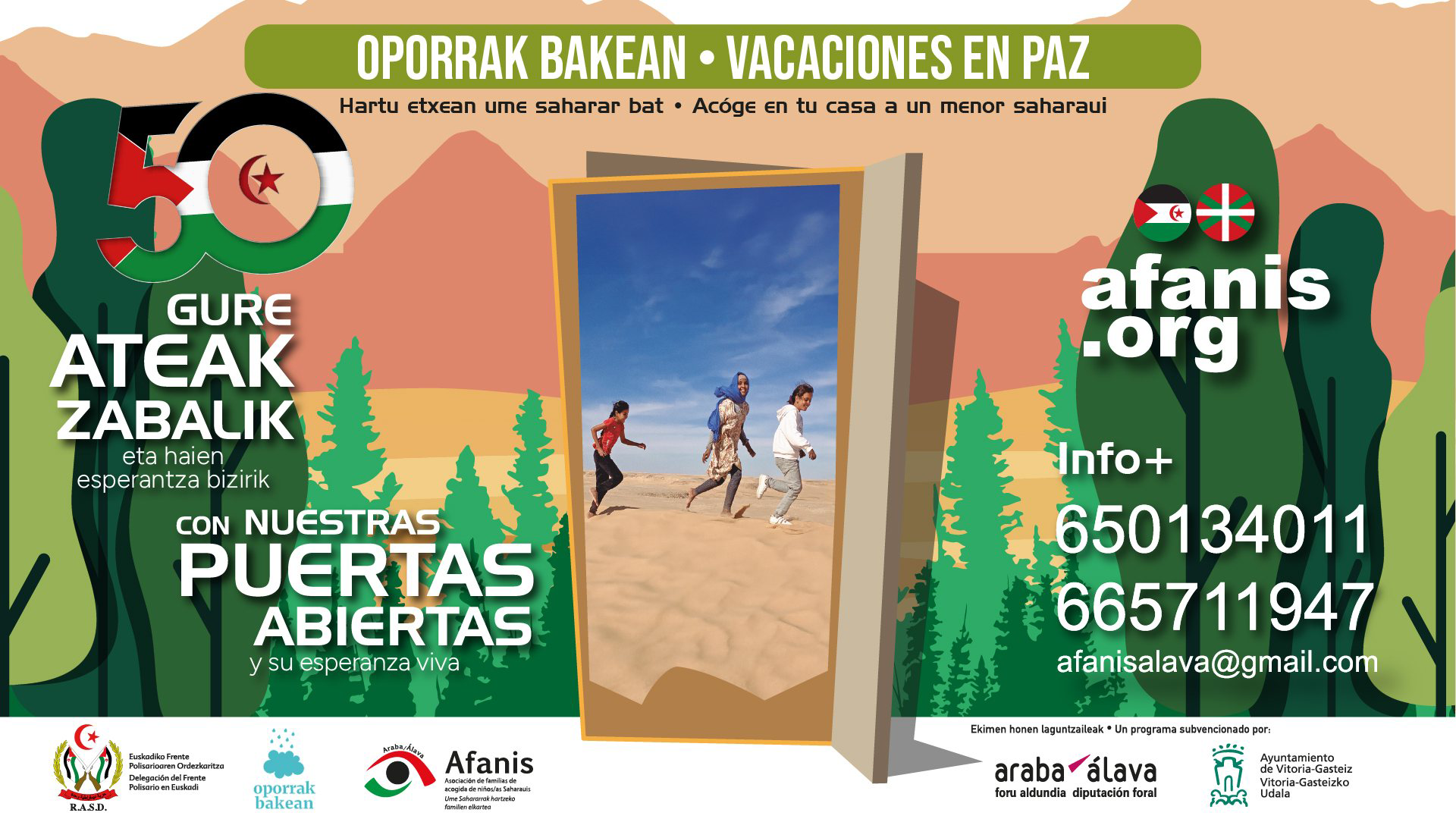 A través del programa Vacaciones en Paz – Oporrak Bakean, impulsado por la Diputación Foral de Álava, existe un año más la posibilidad de realizar una acogida veraniega a niños saharauis en colaboración con la asociación de familias de niños saharauis AFANIS.