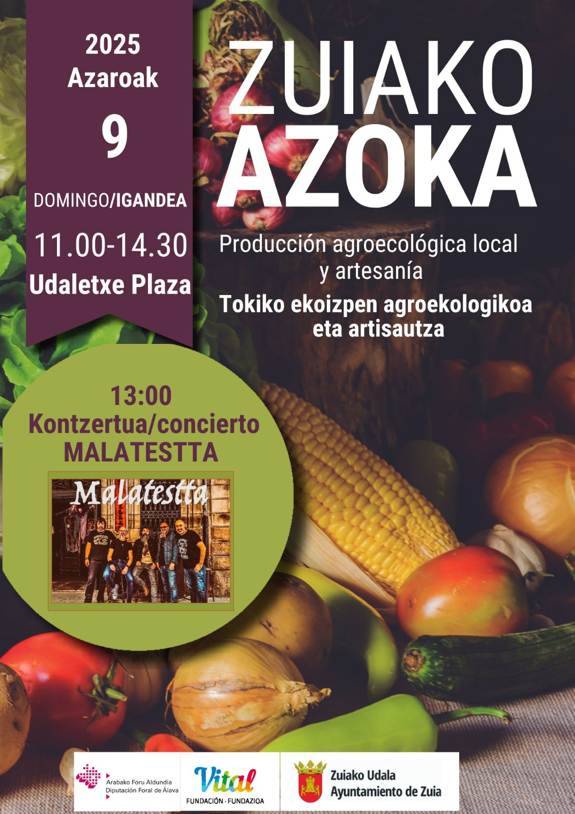 Como es habitual en julio se celebrará la feria de Zuia en la plaza del Ayuntamiento, de 11:00 a 14:30.