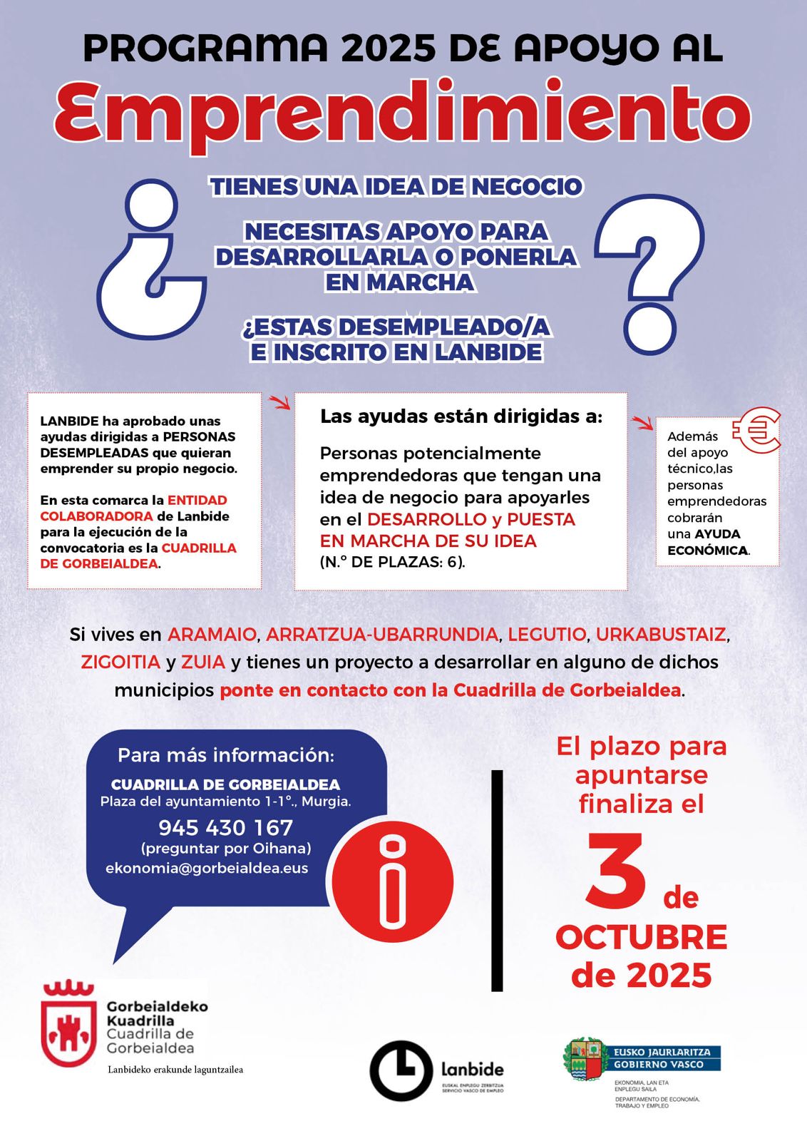 La Cuadrilla de Gorbeialdea, en colaboración con Lanbide, ha lanzado el Programa 2025 de apoyo al emprendimiento para personas desempleadas que deseen poner en marcha su propio negocio.