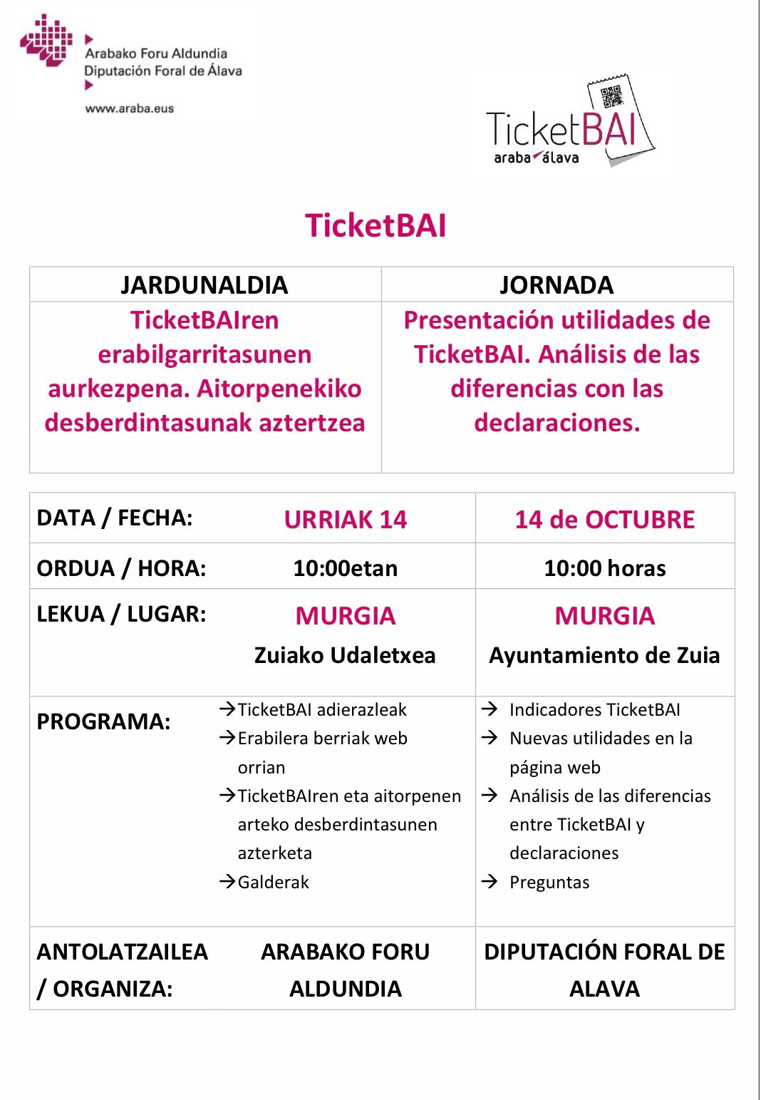 La Diputación Foral de Álava ha organizado una jornada informativa sobre el sistema TicketBAI el próximo 14 de octubre en el Ayuntamiento de Zuia, en Murgia.