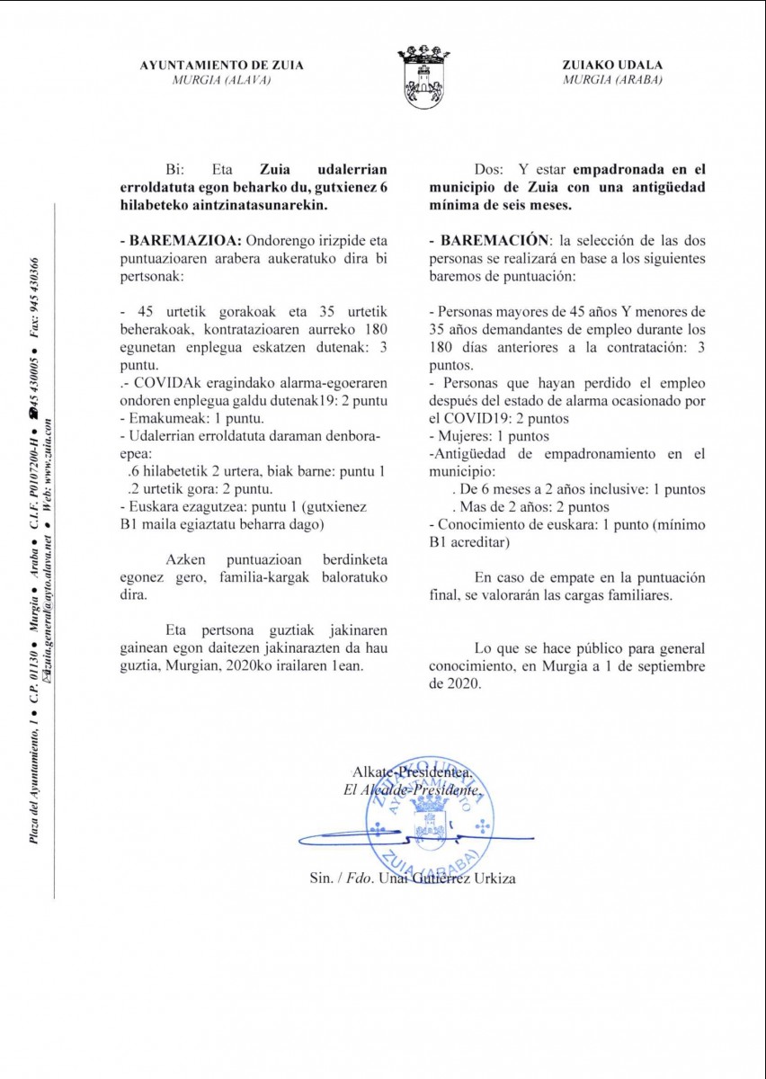 El Ayuntamiento de Zuia va a contratar a dos personas: una a jornada completa durante un plazo de cinco meses, y otra al 65% de jornada y durante un plazo de 3 meses, para realizar trabajos de acondicionamiento y mantenimiento de zonas y jardines públicos, así como su mobiliario, además de procurar la limpieza de sumideros y otros trabajos diversos de mantenimiento.