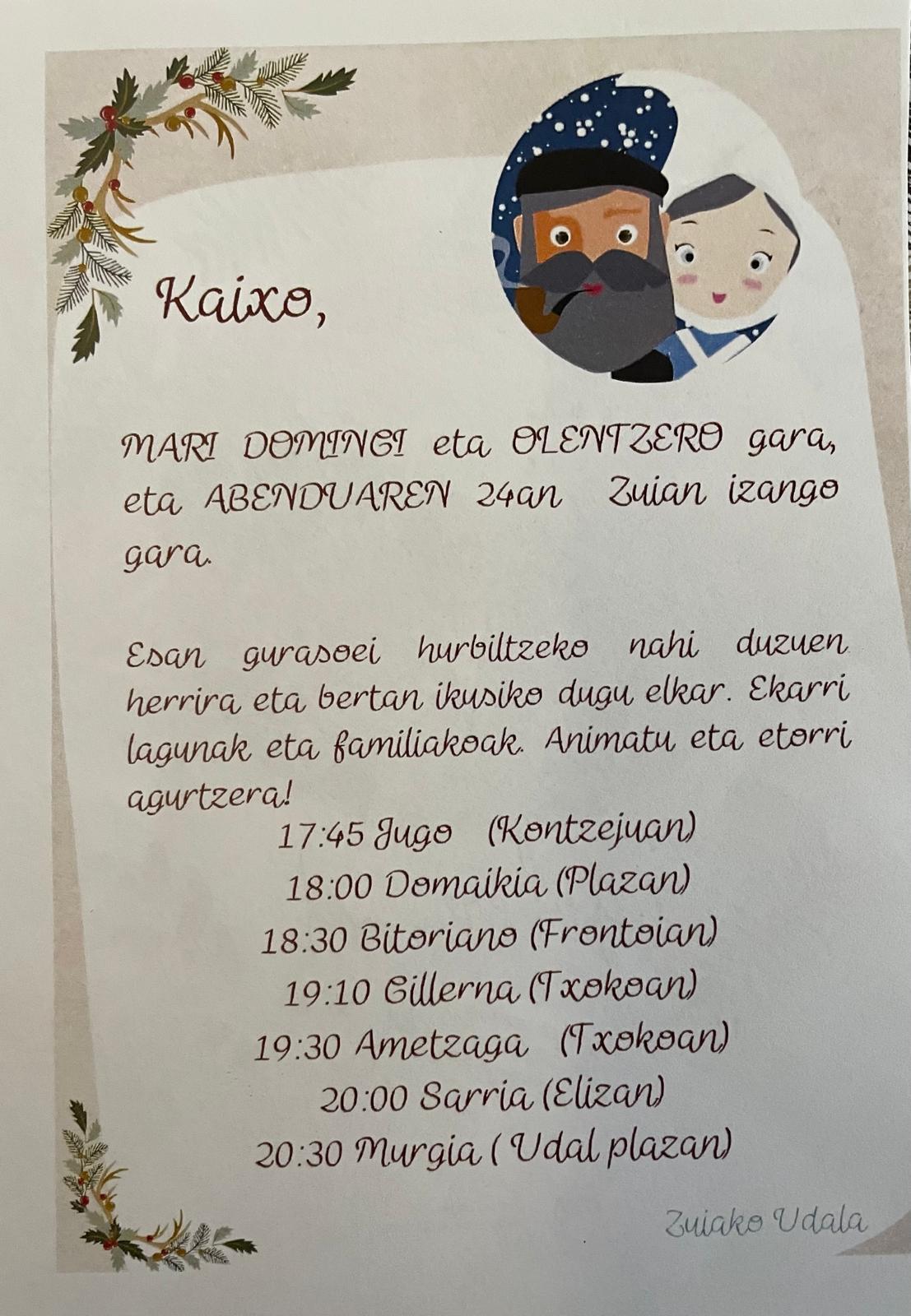 Mari Domingik y Olentzero han dado a conocer que el 24 de diciembre, martes, pasarán por todos los concejos de Zuia.