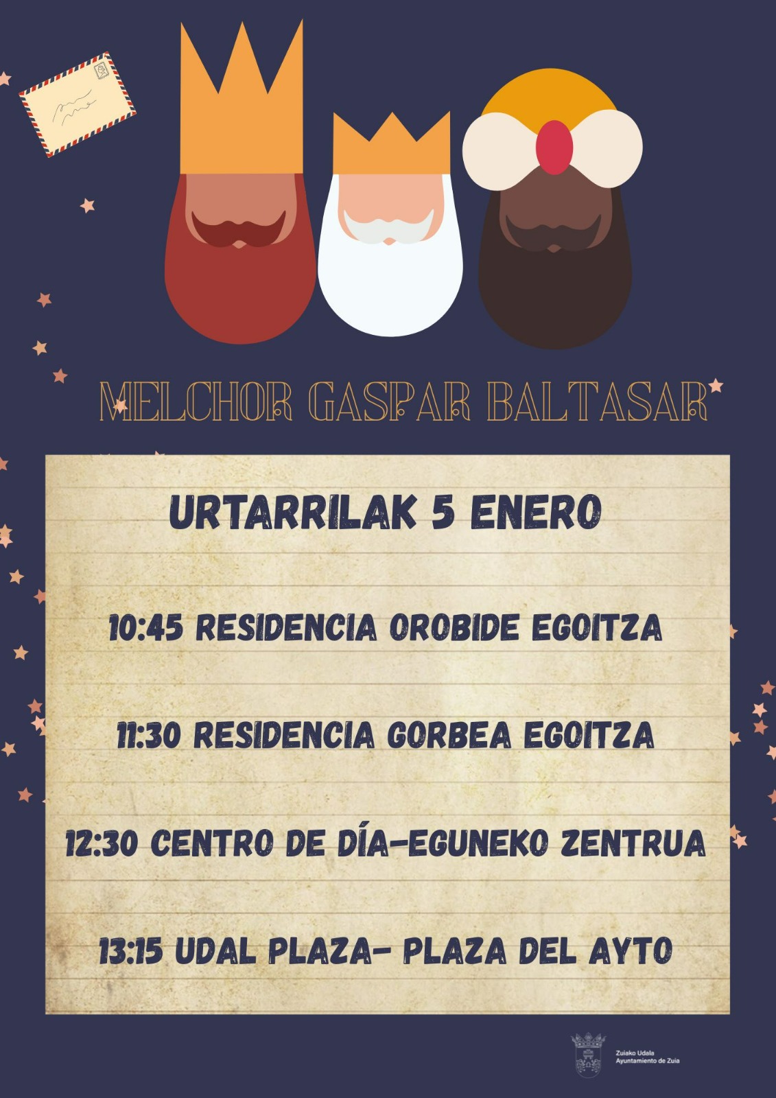El próximo domingo 5 de enero, el municipio de Zuia celebrará la tradicional visita de los Reyes Magos de Oriente, que recorrerán varios espacios del municipio para saludar a vecinos y vecinas de todas las edades.