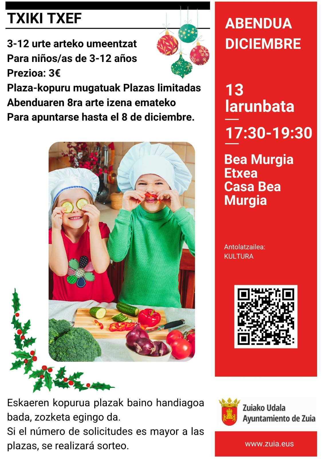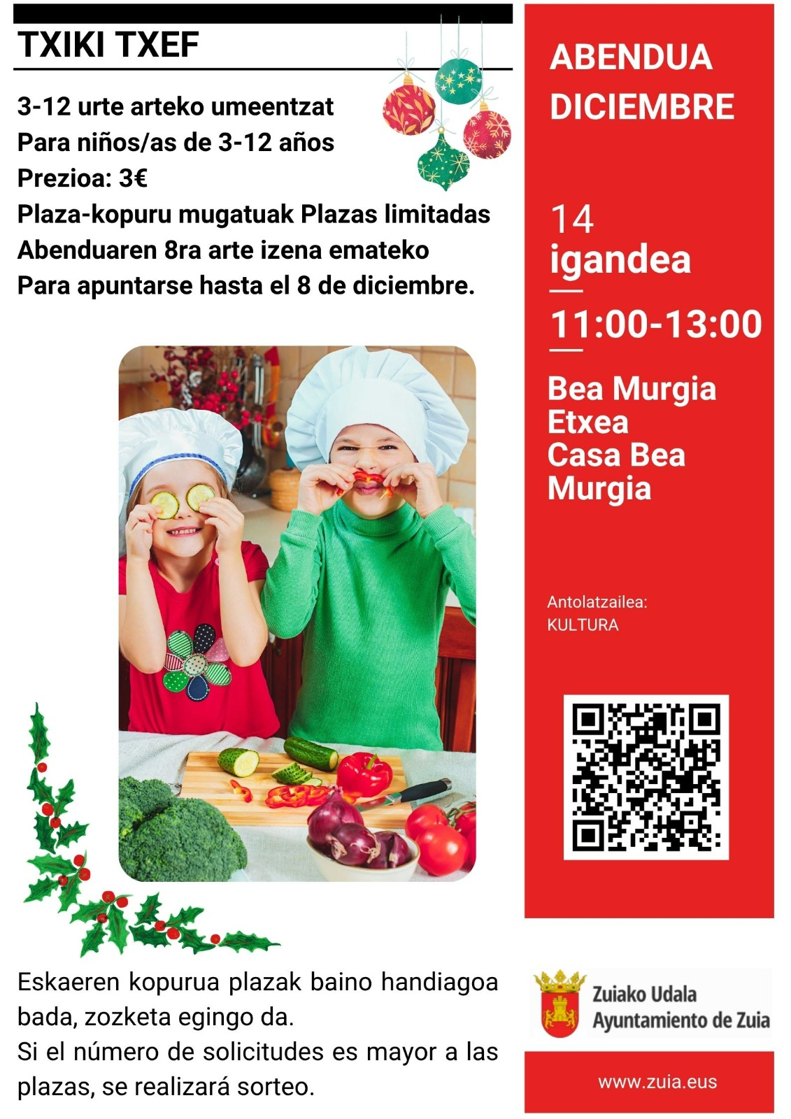 El Ayuntamiento de Zuia ha anunciado que el taller infantil “Txiki Txef”, dirigido a niños y niñas de 3 a 12 años, contará este año con tres sesiones debido a la alta demanda registrada en ediciones anteriores.
