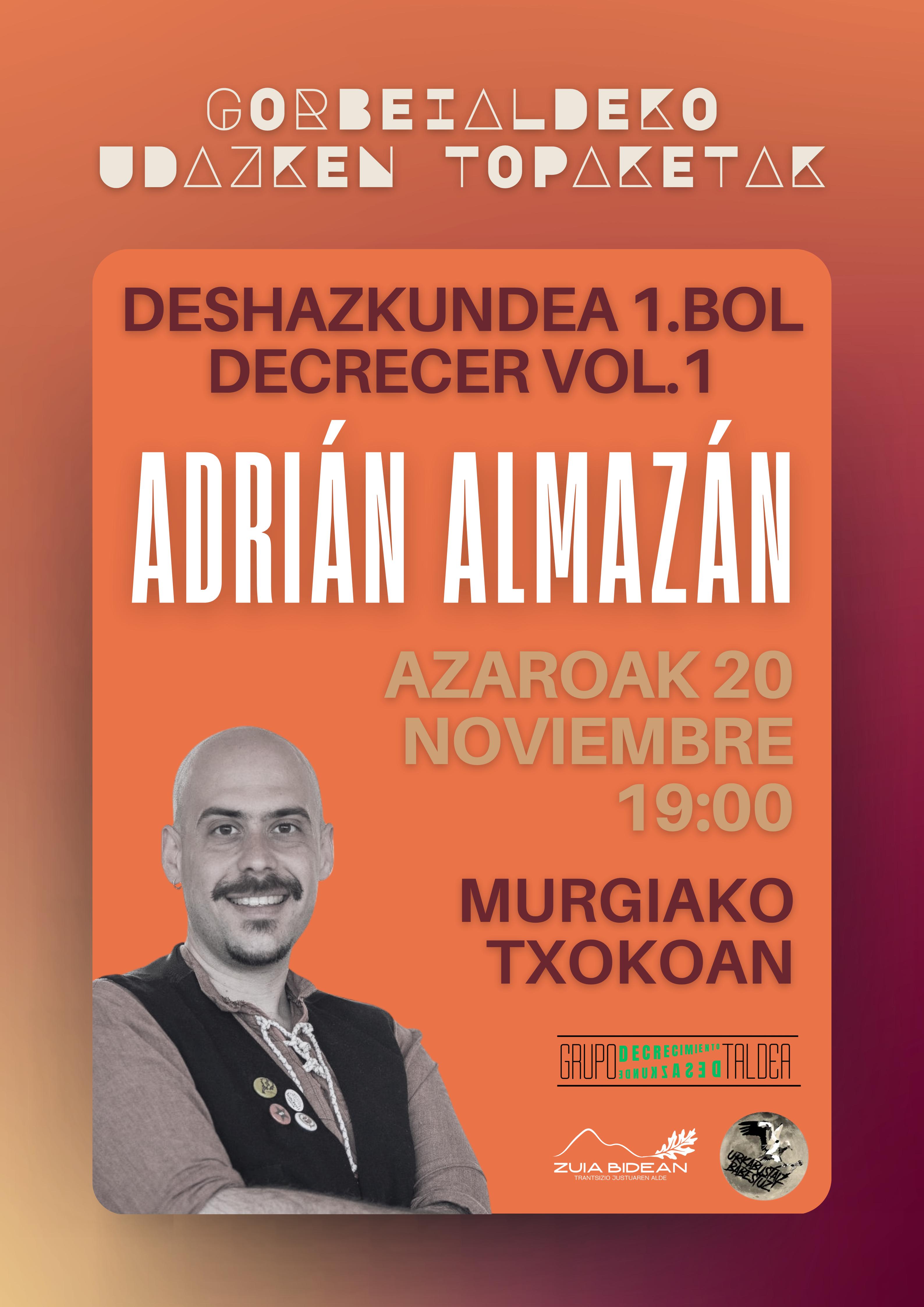 Gorbeialdeko Udazken Topaketak egitarauaren barruan, Adrián Almazán izango da hizlari azaroaren 20an, 19:00etan, Murgiako Txokoan, Deshazkundea 1. bolumena – Decrecer Vol.1 saioan.