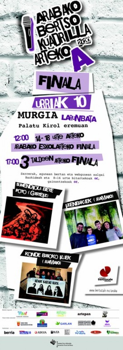 Joan den martxoan bertan behera geratu ondoren, azkenean iritsi da 2020ko Arabako Bertso Kuadrillartekoaren finala. Urriaren 10ean izango da, Palatu kiroldegian, 17:00etan.Aurretik, goizean, 12:00etan, 14 eta 18 urte arteko gaztetxoen eskolarteko finala ere jokatuko da, kiroldegian bertan.