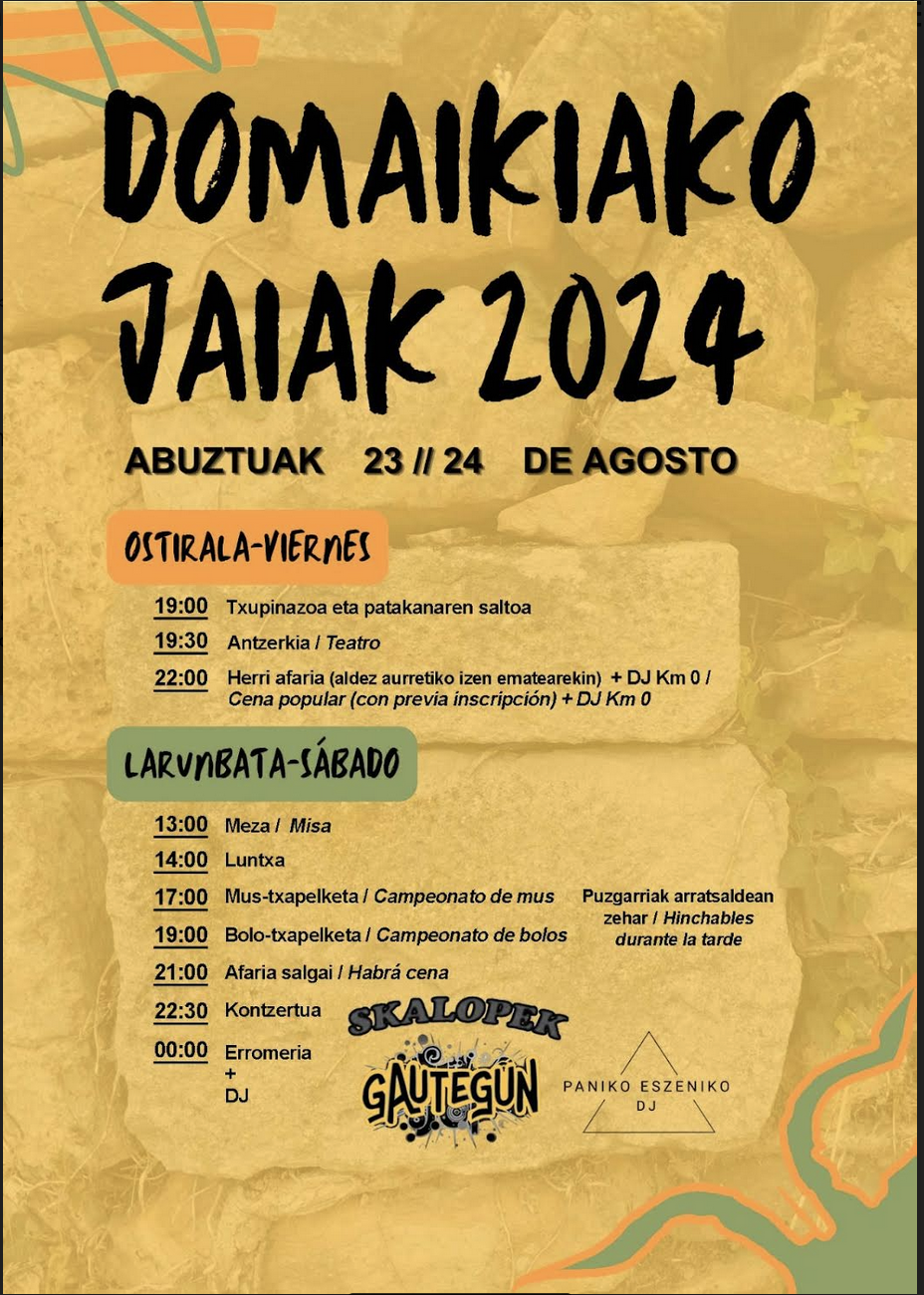 Txupinazoa, antzerkia, herri afaria, DJak, mus eta bolo txapelketak, kontzertuak eta erromeria.
