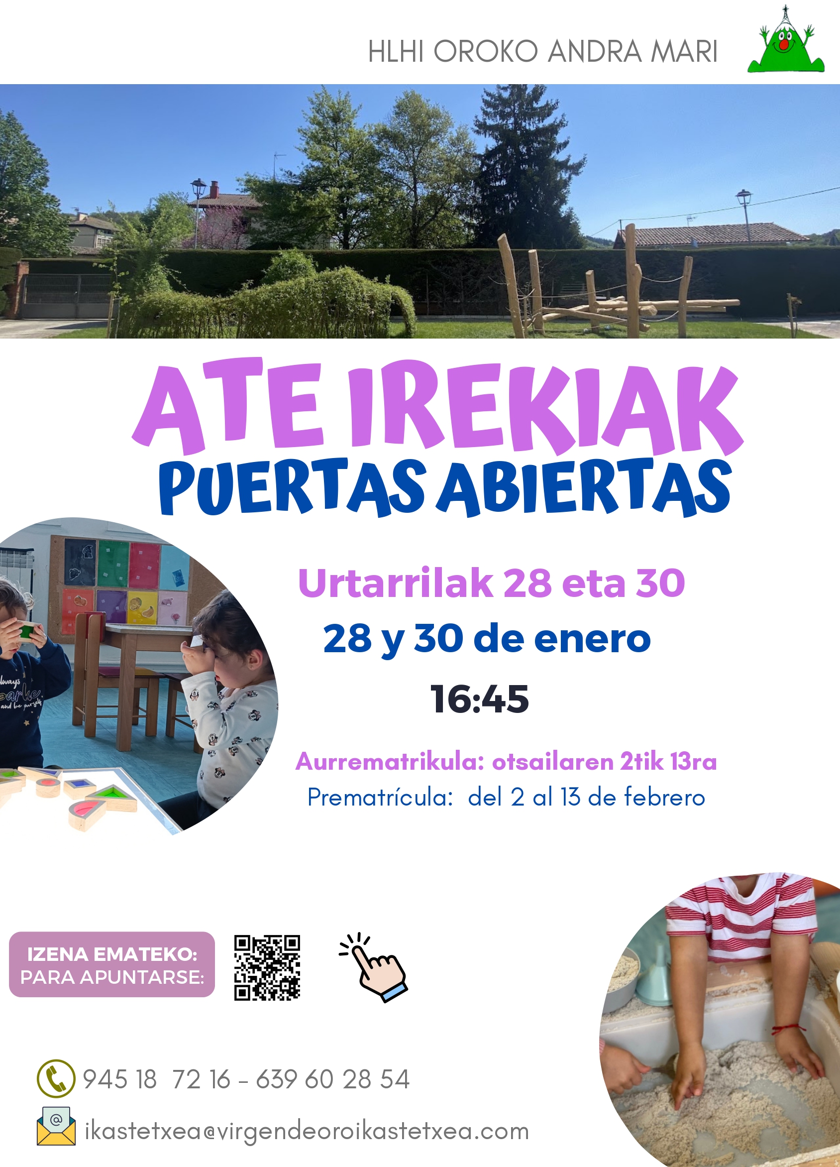 Horrez gain, aurrematrikula epea otsailaren 2tik 13ra izango da. Interesa duten familiek aldez aurretik izena eman dezakete kartelan agertzen den QR kodearen bidez edo ikastetxearekin harremanetan jarriz.
