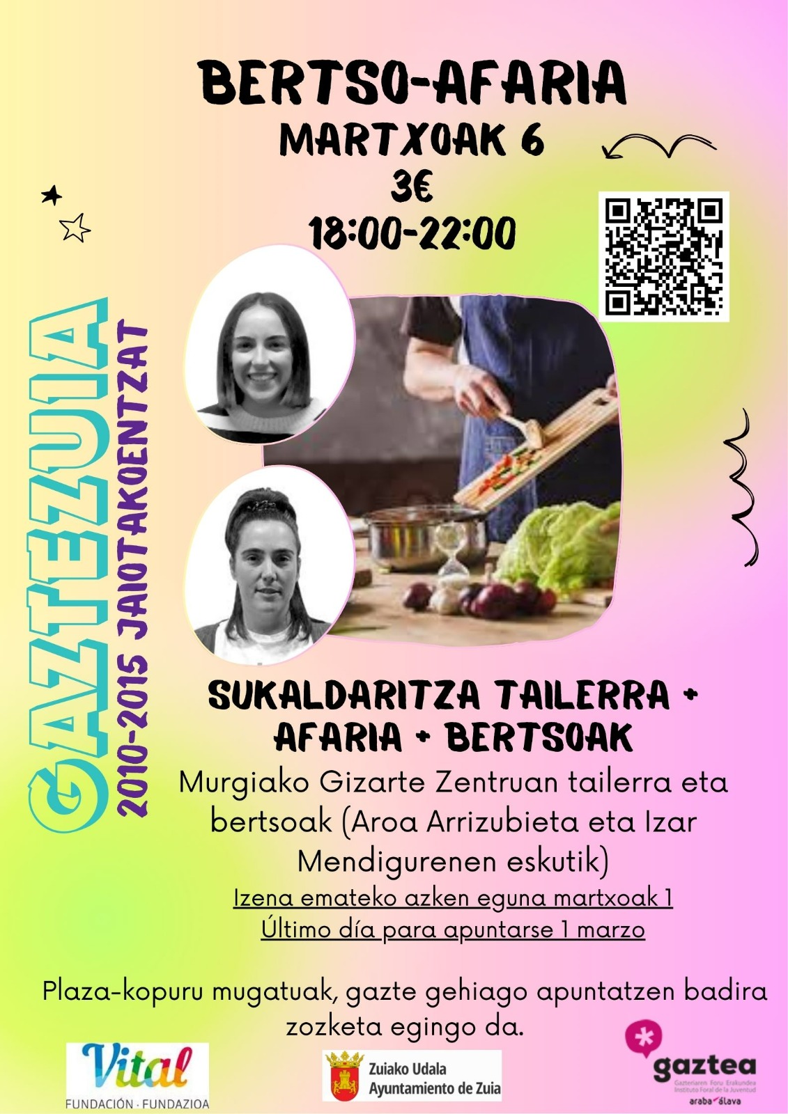GazteZuiak plan berezia prestatu du martxorako: sukaldaritza eta kultura uztartzen dituen arratsalde pasa. 2010 eta 2015 urteen artean jaiotako gazteei zuzendutako ekimena izango da, eta Murgiako Gizarte Zentruan egingo da.