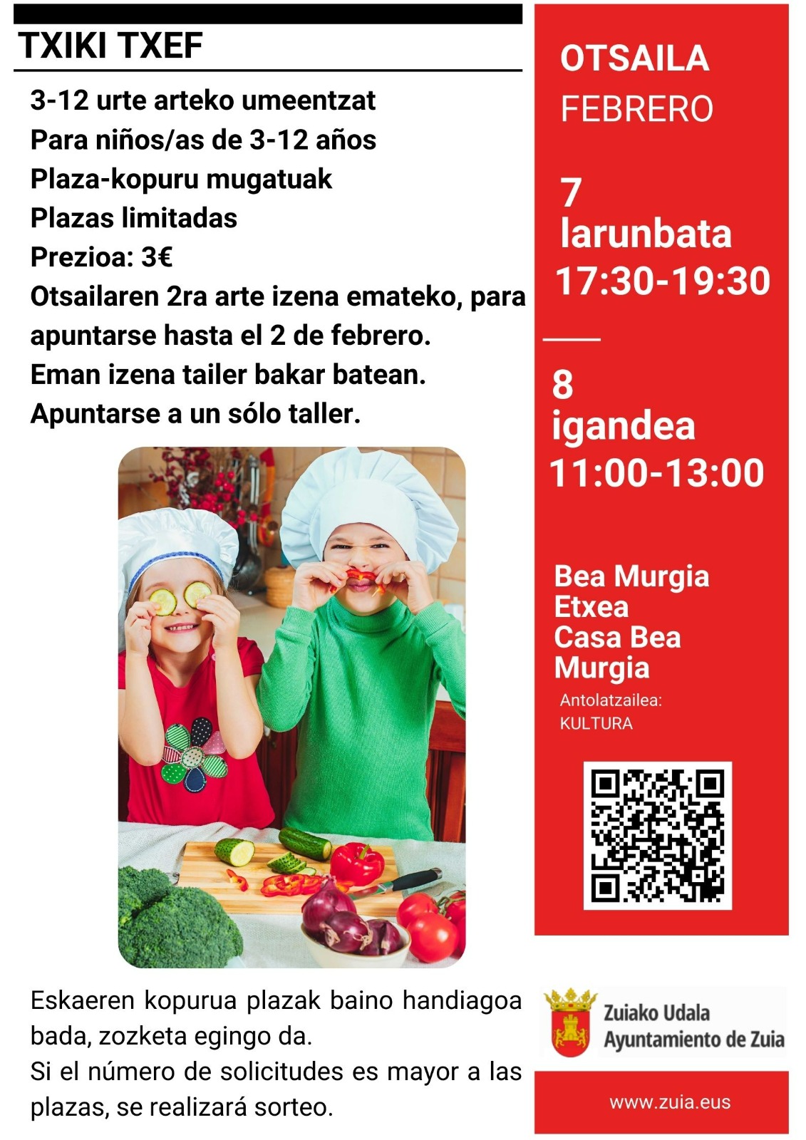 Zuiako Udalak antolatutako eta 3 eta 12 urte bitarteko umeei zuzendutako "Txiki Txef" tailerrak bi saio izango ditu otsailean.