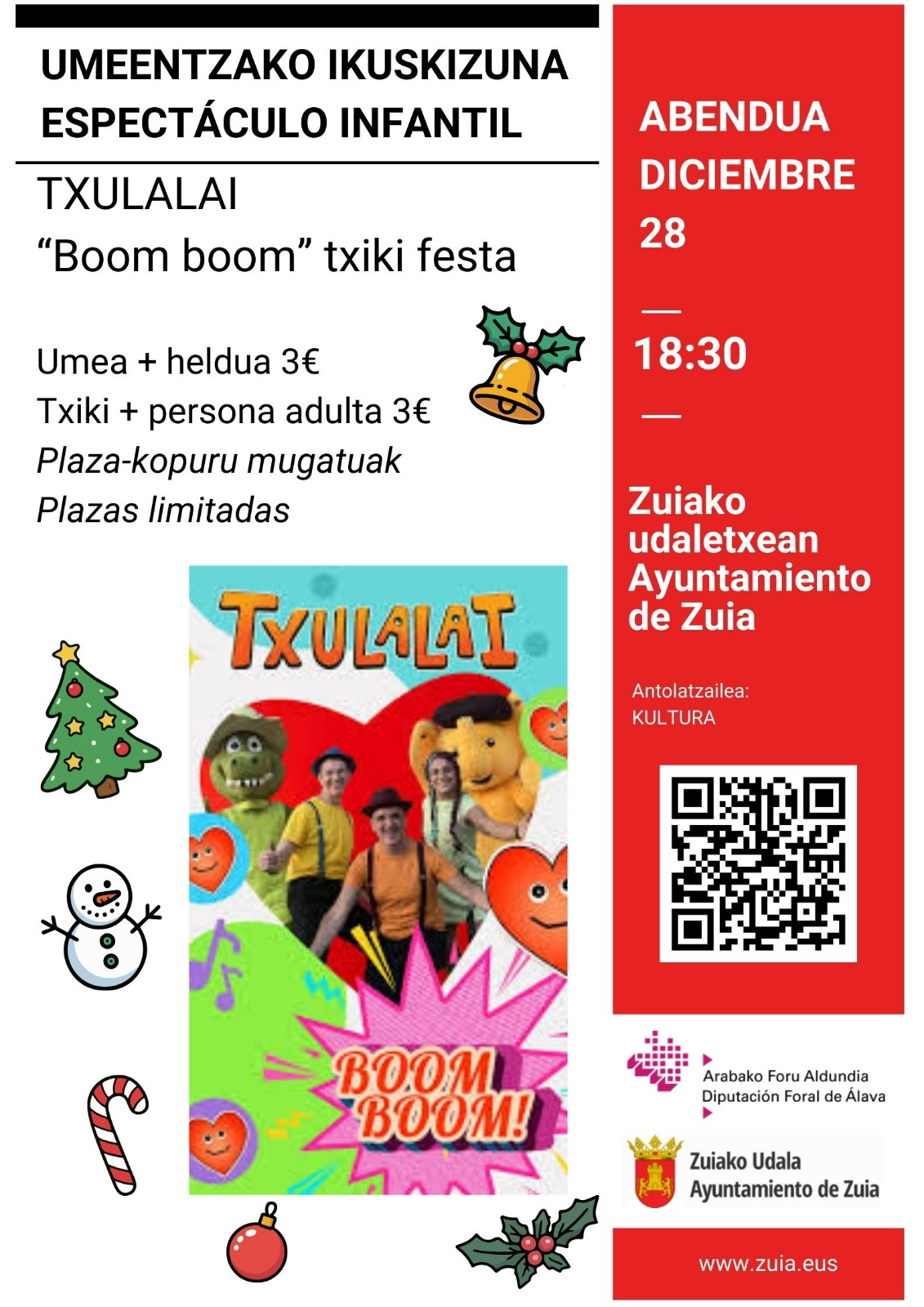 Abenduaren 28an "Boom boom" txiki festa umeentzako ikuskizuna egongo da Zuiako udaletxean, Txulalai taldearen eskutik.