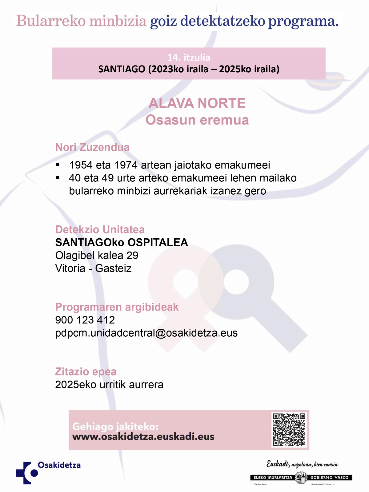 Osakidetzak bularreko minbiziaren detekzio goiztiarreko programaren 14. txanda jarri du martxan, 2023ko irailetik 2025eko irailera bitartean egingo dena. Ekimen hau Araba iparraldeko osasun-eremuko emakumeei zuzenduta dago eta Santiago Ospitalean egingo da.
