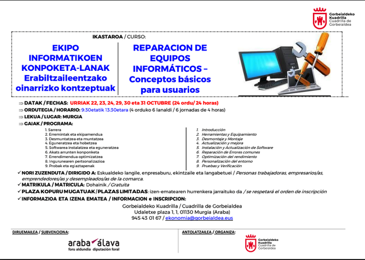 Gorbeialdeko Kuadrillak erabiltzaileek ekipo informatikoak konpontzen ikasteko tailerra antolatu du.