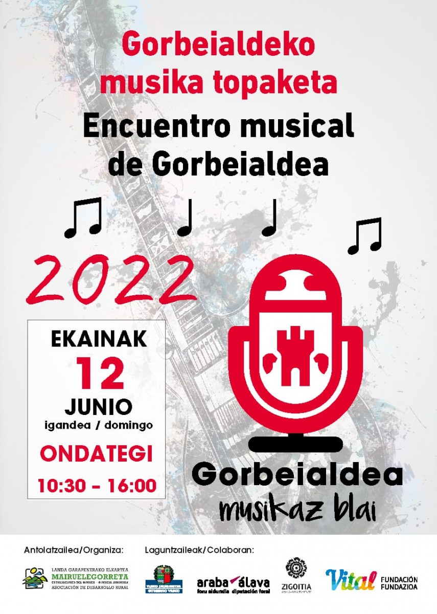 Mairuelegorreta Landa Garapeneko elkarteak antolatuta, Gorbeialdeko Musika Topaketa egingo da ekainaren 12an, igandea, Ondategin, 'Gorbeialdea musikaz blai!' izenpean. Emanaldiak 10:30etik 16:00etara bitartean izango dira.