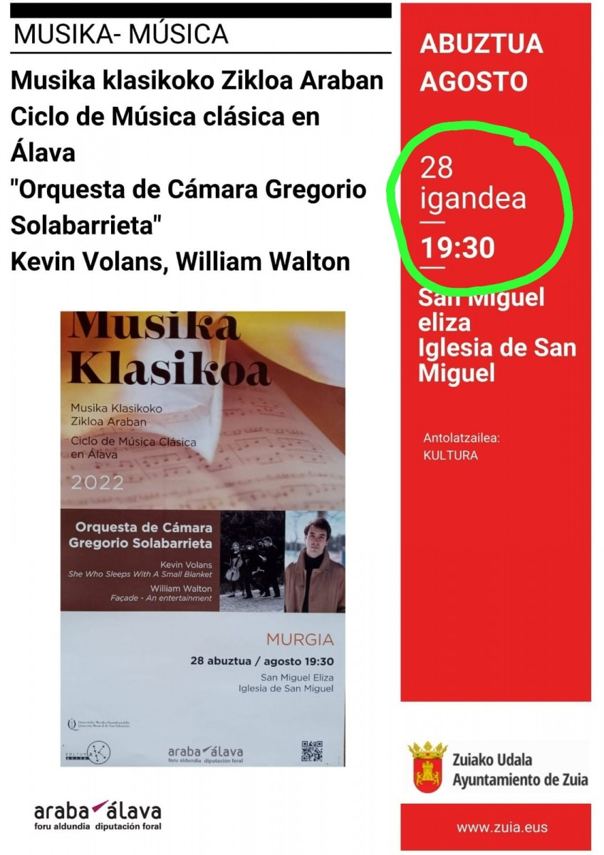 Musika Klasikoko Zikloa Araban-ek antolatuta, igande honetan, abuztuak 28, kontzertua izango da Murgiako San Miguel elizan 19:30ean.
