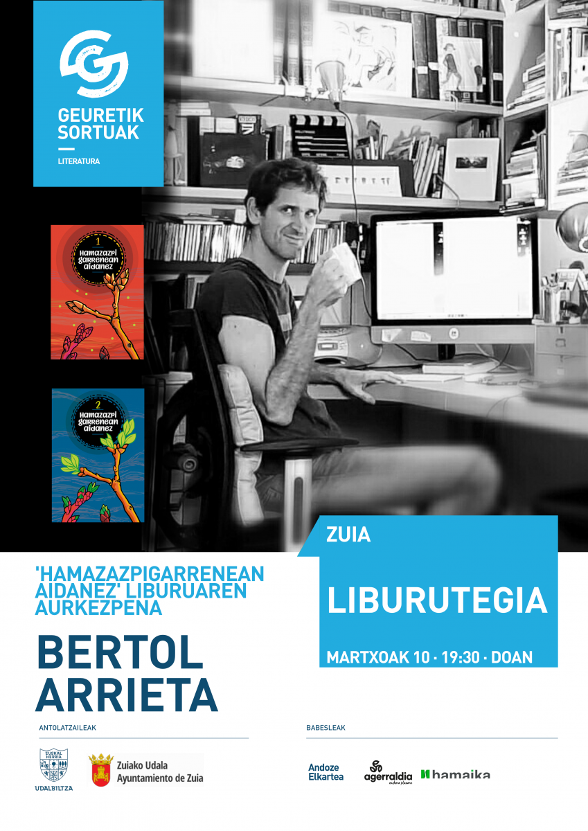 Geuretik sortuak programaren barruan, Bertol Arrieta idazle zarauztarra Zuiako liburutegian izango da datorren martxoaren 10ean, arratsaldeko 19:30etan.