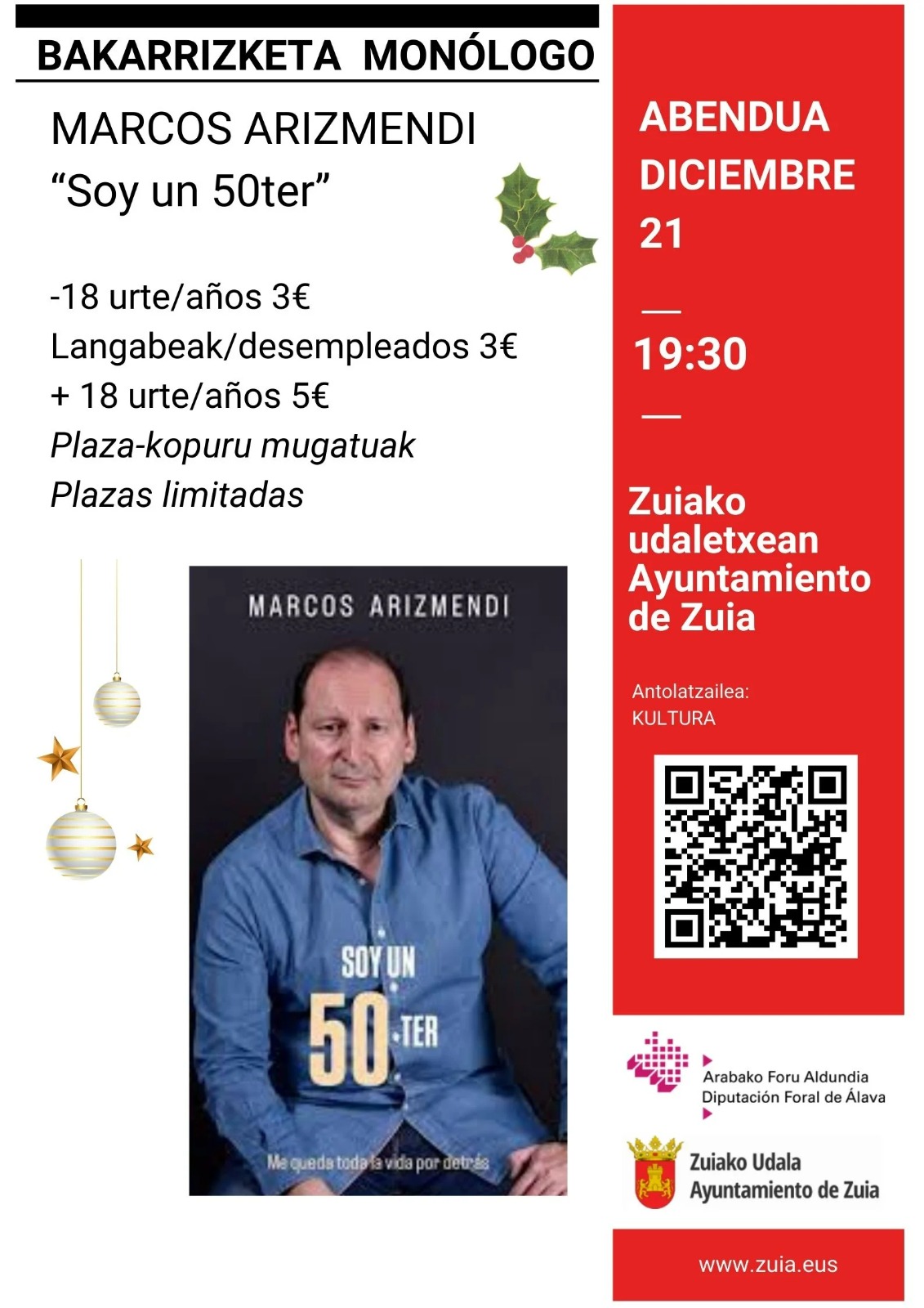 Marcos Arizmendik "Soy un 50ter" bakarrizketa eskainiko du abenduaren 21ean Zuiako udaletxean. Saioa 19:30ean hasiko da.