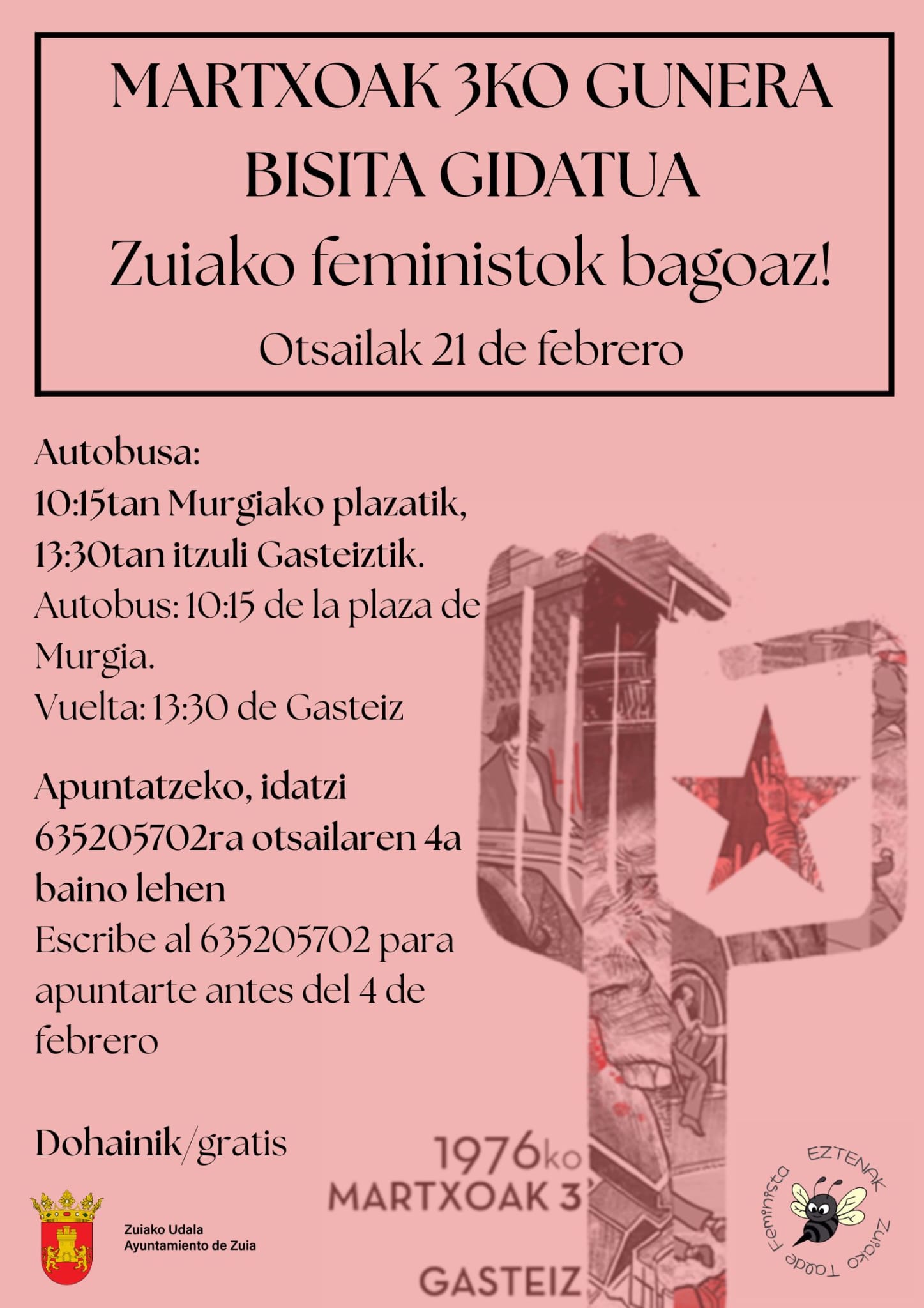 Martxoak 3ko Gasteizko Egunera bisita gidatua egongo da otsailaren 21ean. Autobusa 10:15ean abiatuko da Murgiako plazatik. Bisitaren ondoren, 13:30ean itzuliko dira Gasteiztik. Jarduera doakoa da, baina izena eman behar da otsailaren 4a baino lehen, 635 205 702 zenbakira idatzita.