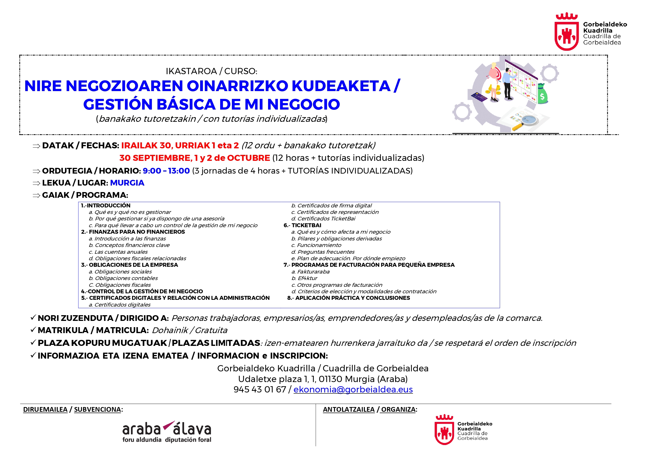 Gorbeialdeko Kuadrillak antolatuta, “Nire negozioaren oinarrizko kudeaketa” ikastaroa egingo da irailaren 30ean, urriaren 1ean eta 2an Murgian, 9:00etatik 13:00etara. Formazioa 12 ordukoa izango da, banakako tutoretzekin osatua, eta eskualdeko langileei, enpresariei, ekintzaileei eta langabeei zuzenduta dago.