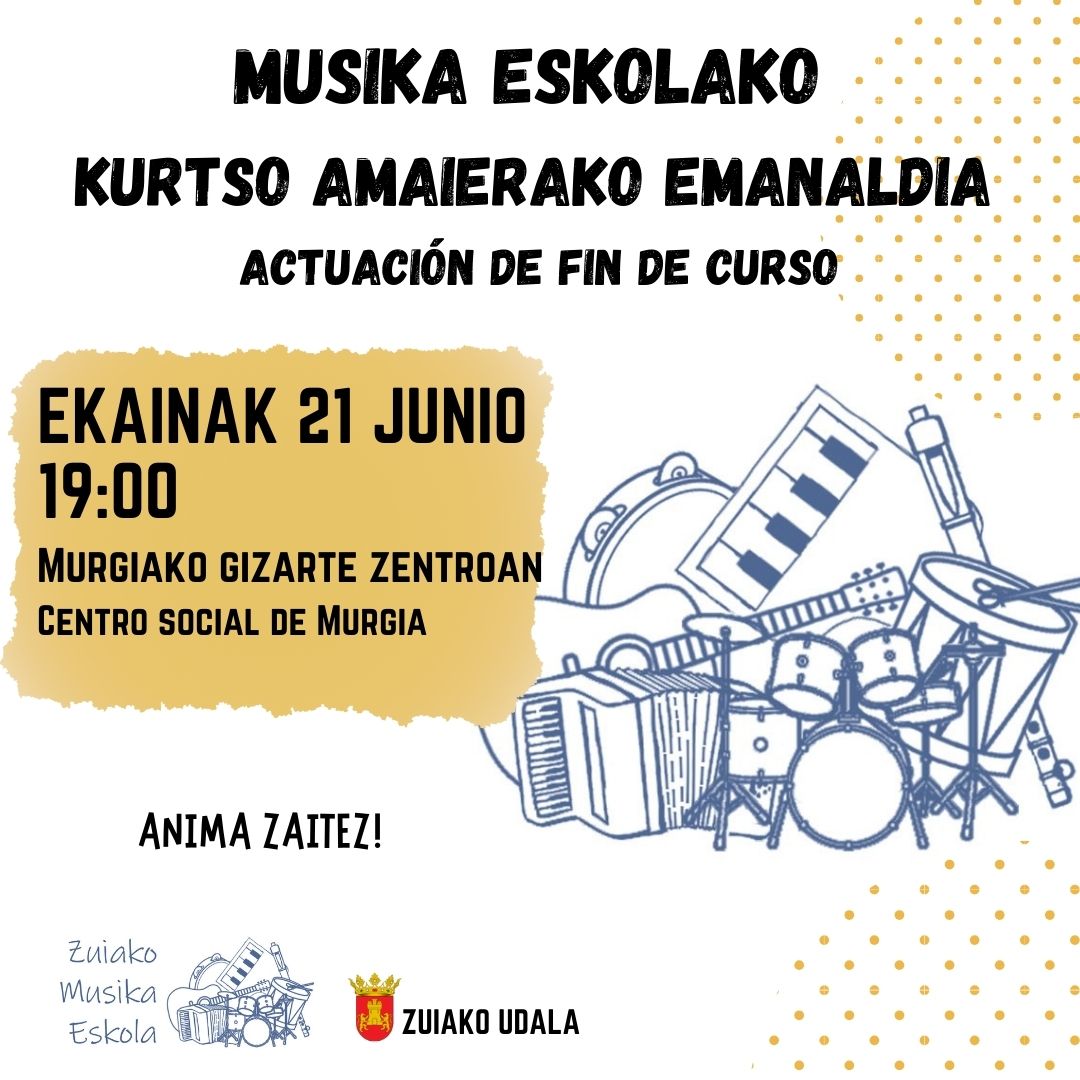 Musika Eskolak kurtso bukaerako kontzertua egingo du ekainaren 21ean, ostirala, Murgiako Gizarte Zentroan, 19:00etan.