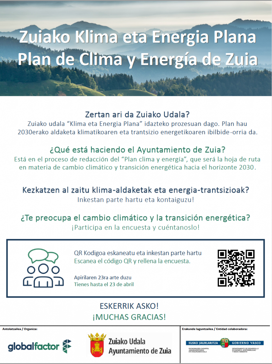 Klima aldaketa arintzeko eta klima aldaketara egokitzeko datozen urteetako jarduera nagusiak zehaztuko dituen Plan hau egiteko, Udalak udalerriko herritarren iritzia, ekarpenak eta parte-hartzea izan nahi ditu. Horregatik, inkesta hau betetzera animatzen ditugu herritar guztiak, Zuiako udalerriarentzat eta etorkizunarentzat hain garrantzitsua den Plana diseinatzen eta egiten lagunduko baitigu.