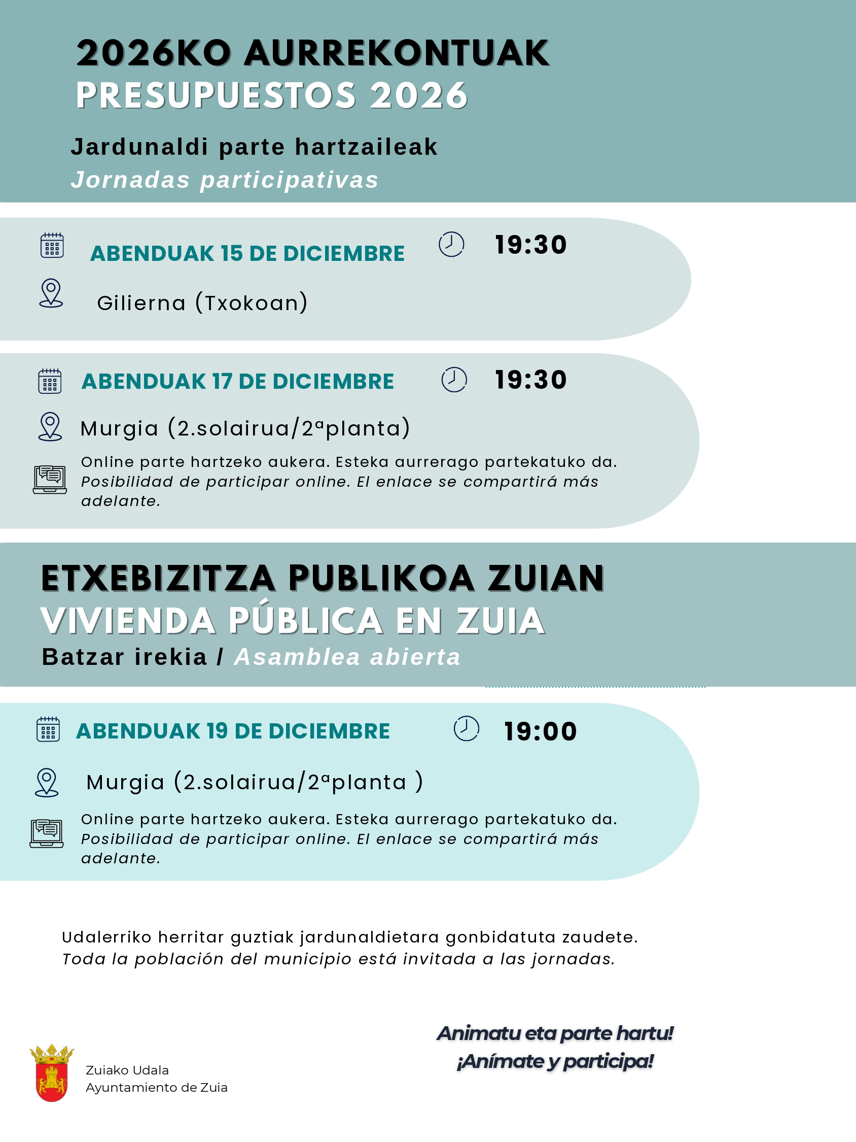 Udalak hiru hitzordu zehaztu ditu abenduaren erdialderako: bi saio 2026ko aurrekontu parte-hartzaileak aztertzeko izango dira, eta hirugarren bat, batzar irekia, Zuian etxebizitza publikoaren egoeraz aritzeko.